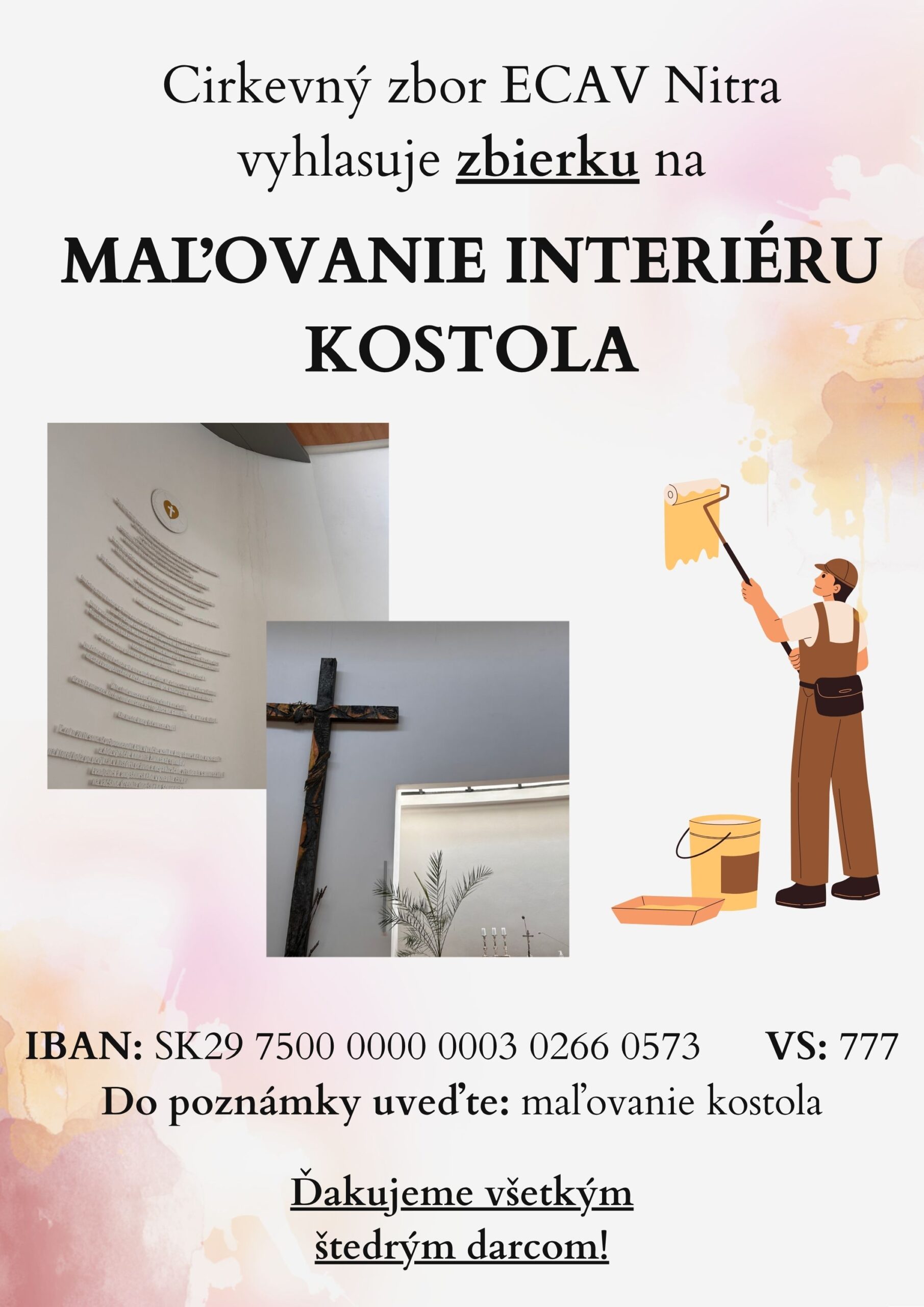 Cirkevný zbor ECAV Nitra vyhlasuje zbierku na maľovanie interiéru kostola, ktoré tento rok plánujeme realizovať. Ďakujeme všetkým štedrým darcom za milodary.